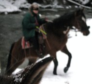 Our creeks are very rocky, and deep, and have about 2 to 5 inches of hard ice on top and snow on top of the ice. Our other horses cross them and are calm when the ice makes the cracking sound and they drop down into the dark, cold water and the ice cracks again with each step. They just deal with it.