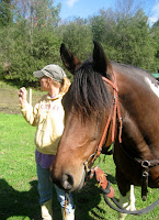 The next thing I know I am away from the barn about 300 feet and no problems but believe me when I realize this I start thinking bad things like oh god what happens if I meet a deer or something could come out from the tree up ahead or just anything stupid so I starting singing about yes you said it Peanut Butter and Jelly.  I dont have woods to ride in but I do have fields and one of the things that always scared me about that is open fields, not good she could take off with me at any time so I did alot of walk stop again and circling keeping my mind on my tasks and nothing else I would say okay we are going to the right or going to the left or walk, stop, walk stop, okay turning to the left again no I think to the right this time saying these things as I did them.  The one thing that mary said to me was if you need to stop do not face her to the barn so when I did stop her or even circle I would always face away and even let her graze a little.